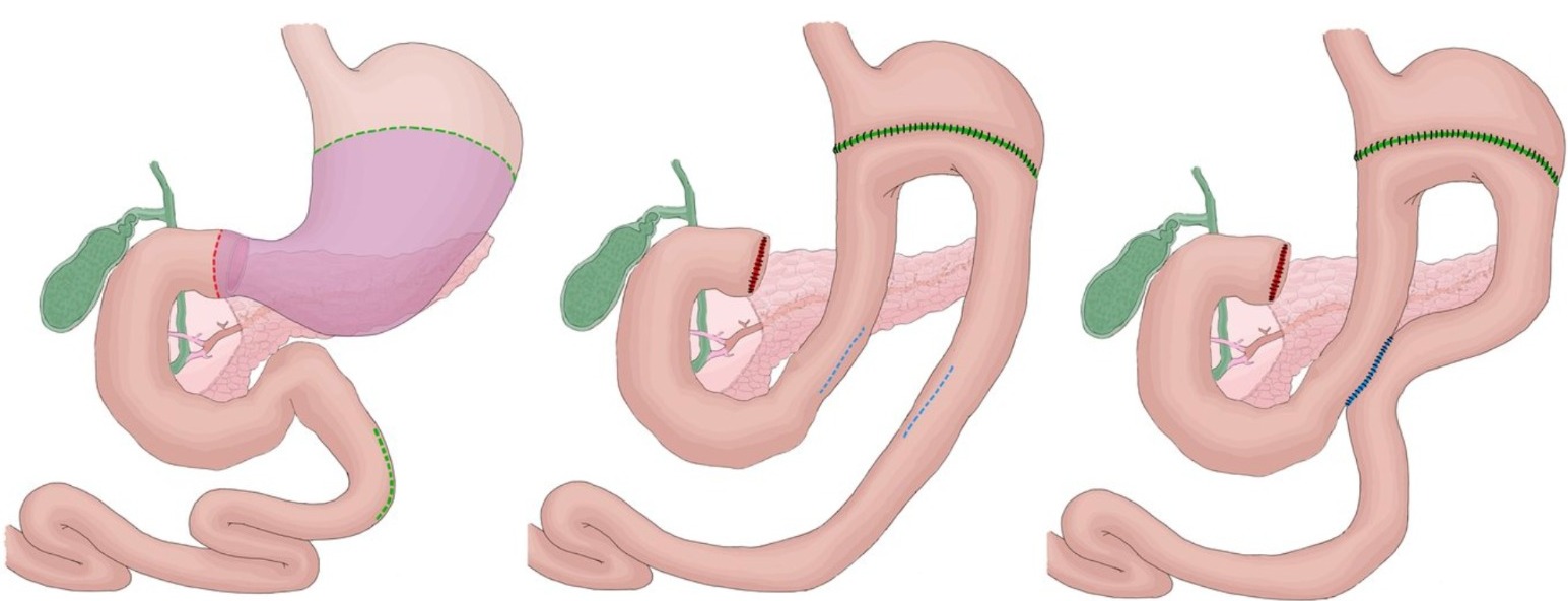 • Üstte kalan uç ise yemek borusuyla birleştirilmiş olan jejenum kısmının yemek borusundan sonraki yaklaşık 40. Cm sine uç yan şeklinde anastomoz (jejenojejenostom) yapılarak safra ve pankreatik salgıların yemek borusuna ulaşıp ona zarar vermeden sindirim sistemine akması sağlanır.